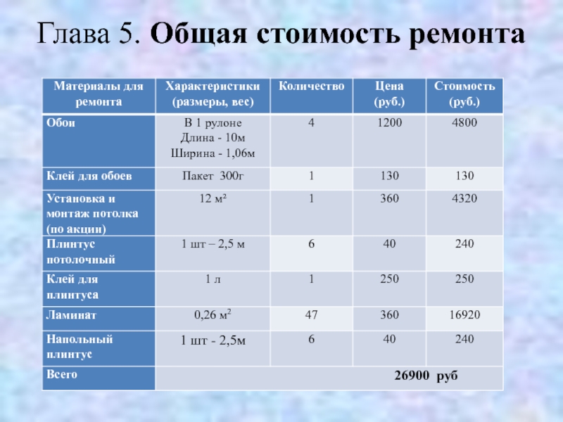 Слайд 8Глава 5. Общая стоимость ремонта