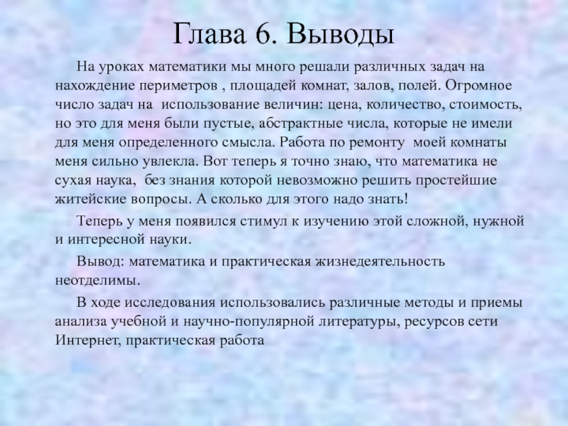 на нахождение периметров , площадей комнат, залов, полей. Огромное число задач на использование величин: цена, количество, стоимость, но это для меня были пустые, абстрактные числа, которые не имели для меня определенного смысла. Работа по ремонту моей комнаты меня сильно увлекла. Вот теперь я точно знаю, что математика не сухая наука, без знания которой невозможно решить простейшие житейские вопросы. А сколько для этого надо знать!