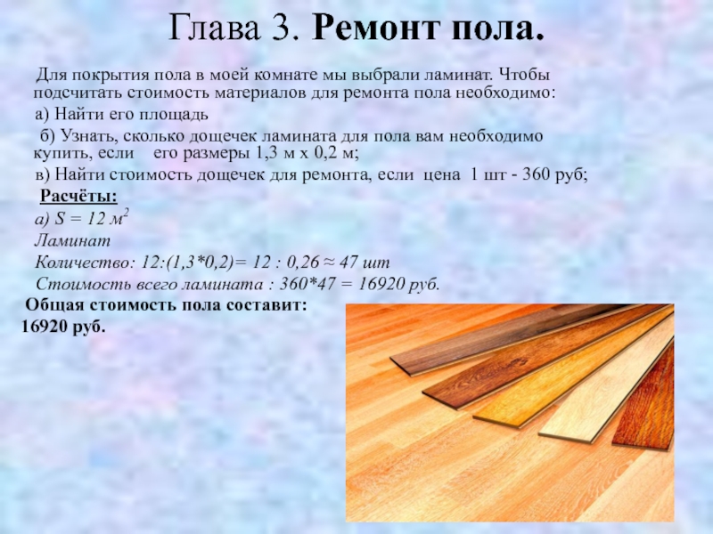 Слайд 6Глава 3. Ремонт пола.