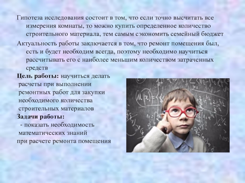 Актуальность работы заключается в том, что ремонт помещения был, есть и будет необходим всегда, поэтому необходимо научиться рассчитывать его с наиболее меньшим количеством затраченных средств