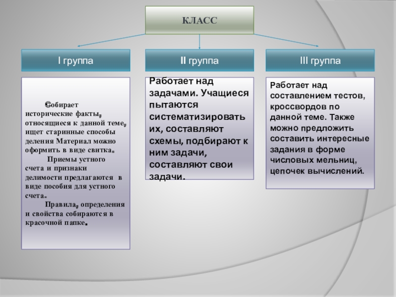 Cобирает исторические факты, относящиеся к данной теме, ищет старинные способы деления Материал можно оформить в виде свитка.