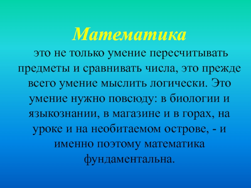 это прежде всего умение мыслить логически. Это умение нужно повсюду: в биологии и языкознании, в магазине и в горах, на уроке и на необитаемом острове, - и именно поэтому математика фундаментальна.