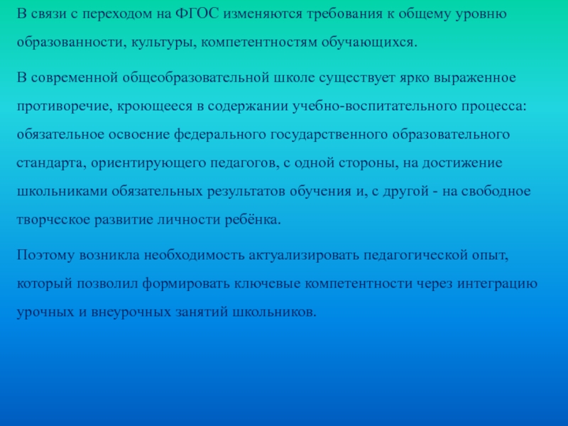 Поэтому возникла необходимость актуализировать педагогической опыт, который позволил формировать ключевые компетентности через интеграцию урочных и внеурочных занятий школьников.