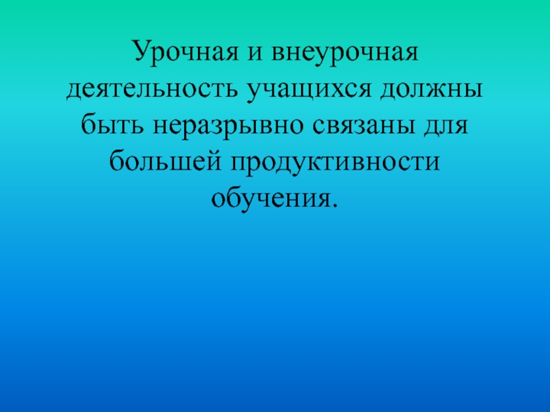 Слайд 9Урочная и внеурочная деятельность учащихся должны быть неразрывно связаны для большей