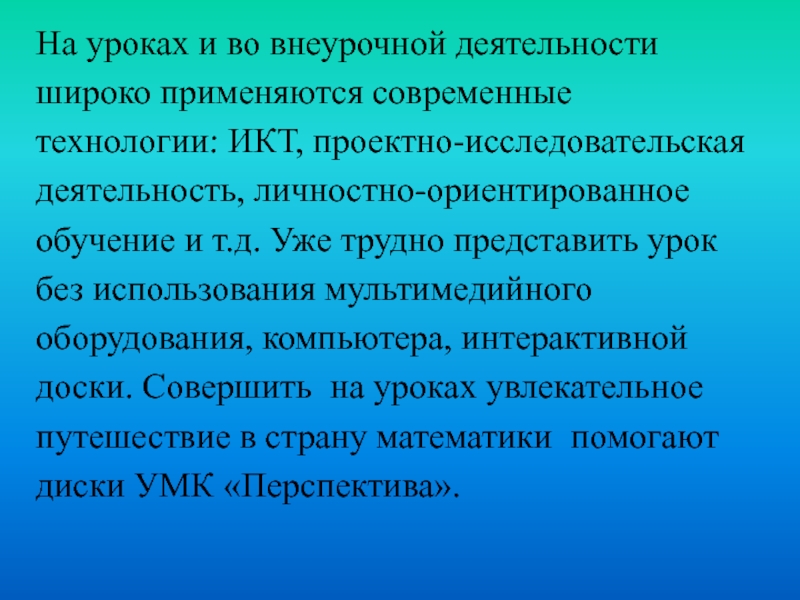 проектно-исследовательская деятельность, личностно-ориентированное обучение и т.д. Уже трудно представить урок без использования мультимедийного оборудования, компьютера, интерактивной доски. Совершить на уроках увлекательное путешествие в страну математики помогают диски УМК «Перспектива».