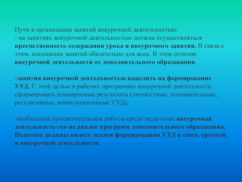 -необходима просветительская работы среди педагогов: внеурочная деятельность-это не аналог программ дополнительного образования. Педагоги должны видеть задачи формирования УУД и связь урочной и внеурочной деятельности.