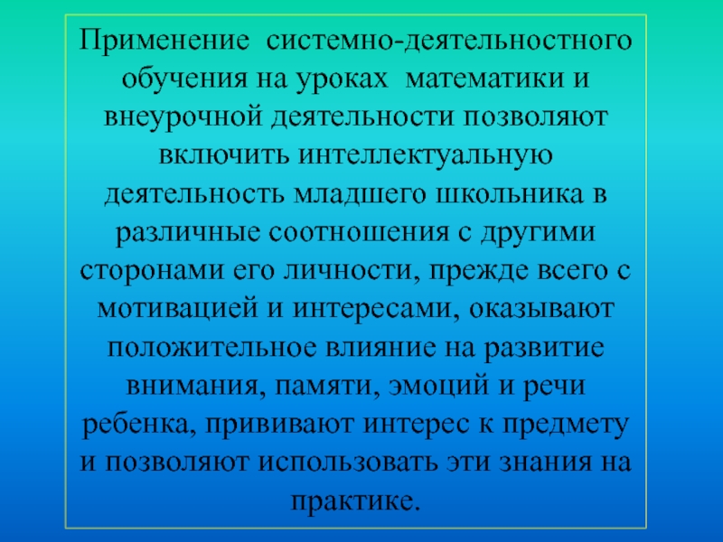 Слайд 32Применение системно-деятельностного обучения на уроках математики и внеурочной деятельности позволяют включить