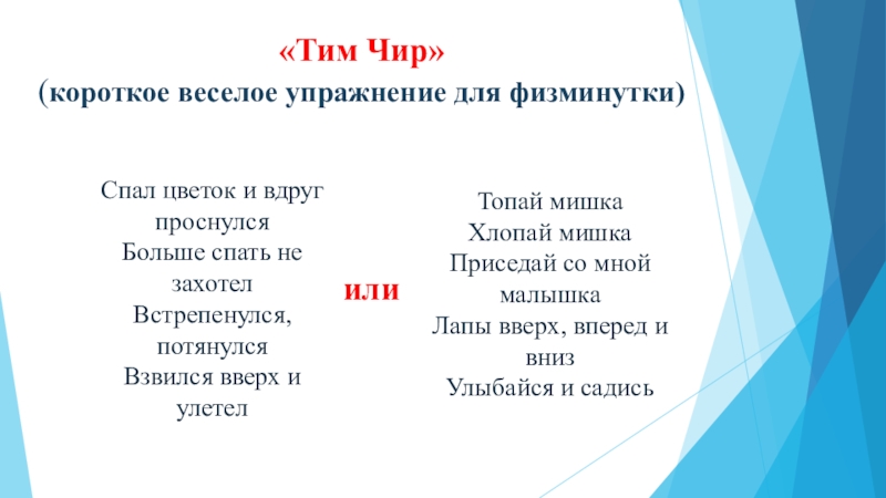 Данный прием можно заменить на хлопки: учитель делает два медленных хлопка и следом три быстрых; ученики отвечают двумя хлопками, показывая то что они готовы слушать учителя