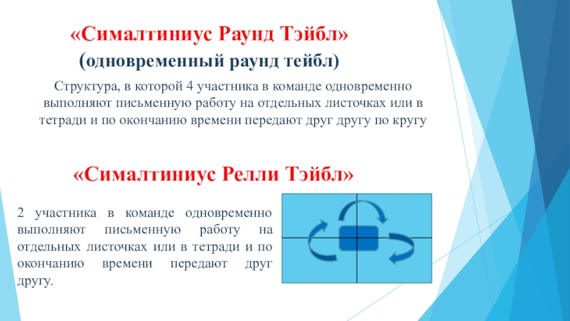 2 участника в команде одновременно выполняют письменную работу на отдельных листочках или в тетради и по окончанию времени передают друг другу.