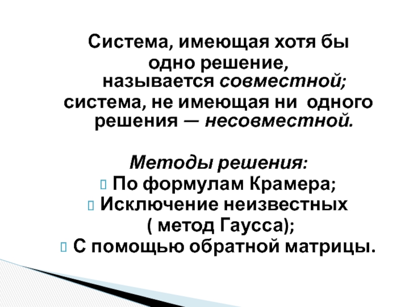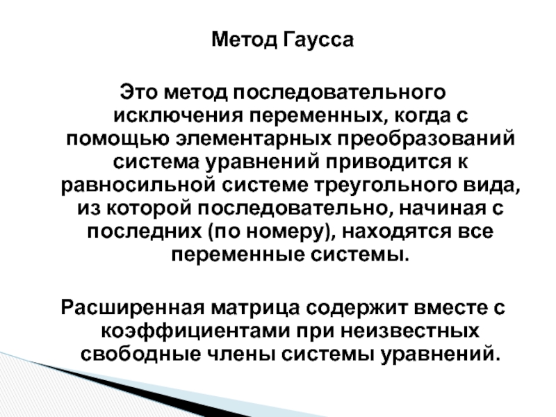 уравнений приводится к равносильной системе треугольного вида, из которой последовательно, начиная с последних (по номеру), находятся все переменные системы.