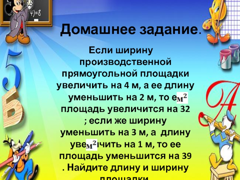 площадки увеличить на 4 м, а ее длину уменьшить на 2 м, то ее площадь увеличится на 32 ; если же ширину уменьшить на 3 м, а длину увеличить на 1 м, то ее площадь уменьшится на 39 . Найдите длину и ширину площадки.
