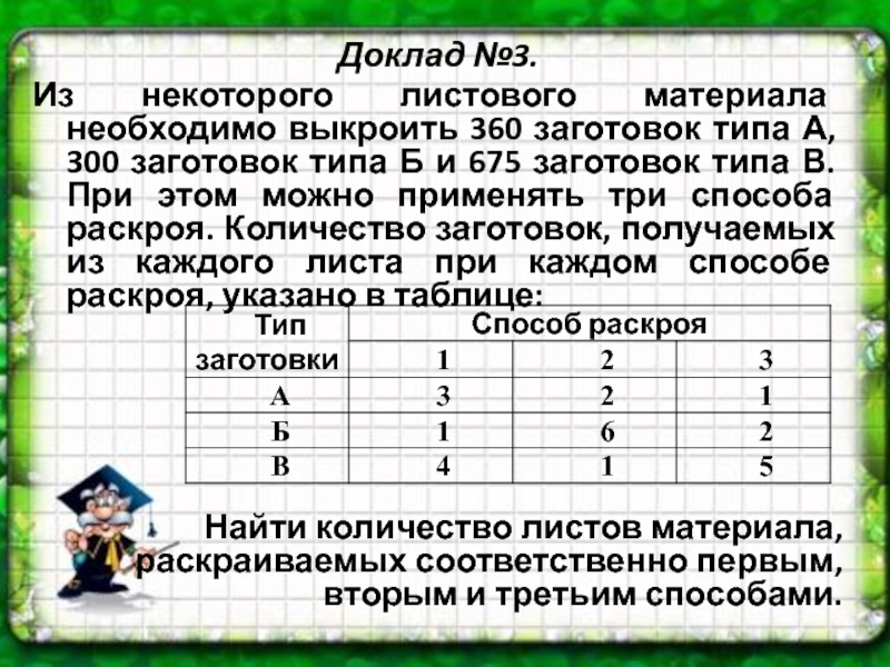 А, 300 заготовок типа Б и 675 заготовок типа В. При этом можно применять три способа раскроя. Количество заготовок, получаемых из каждого листа при каждом способе раскроя, указано в таблице: