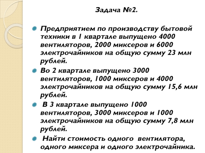 Найти стоимость одного вентилятора, одного миксера и одного электрочайника.