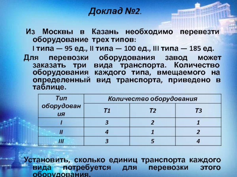 Установить, сколько единиц транспорта каждого вида потребуется для перевозки этого оборудования.