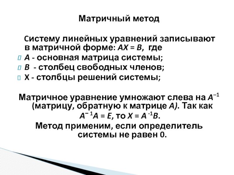 Матричное уравнение умножают слева на A–1 (матрицу, обратную к матрице A). Так как