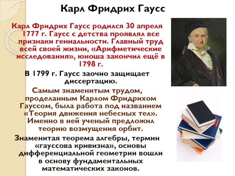 Знаменитая теорема алгебры, термин «гауссова кривизна», основы дифференциальной геометрии вошли в основу фундаментальных математических законов.