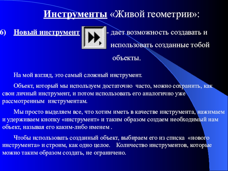 Чтобы использовать созданный объект, выбираем его из списка «нового инструмента» и строим, как одно целое. Количество инструментов, которые можно таким образом создать, не ограничено.