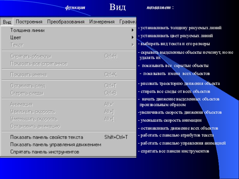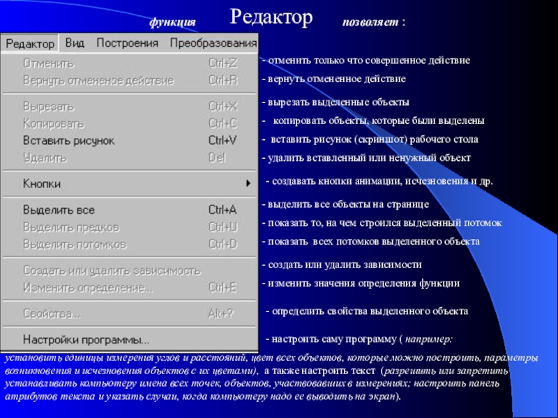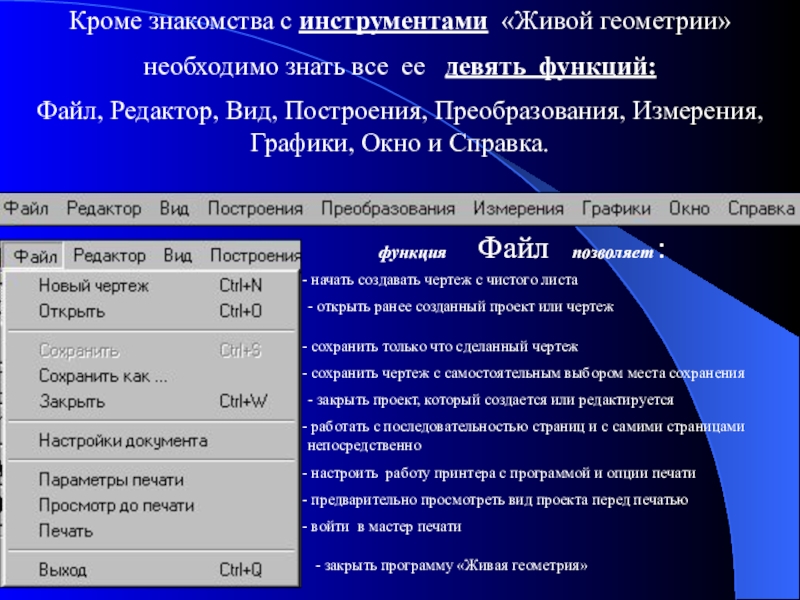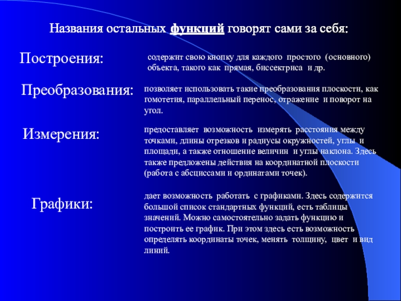 предоставляет возможность измерять расстояния между точками, длины отрезков и радиусы окружностей, углы и площади, а также отношение величин и углы наклона. Здесь также предложены действия на координатной плоскости (работа с абсциссами и ординатами точек).