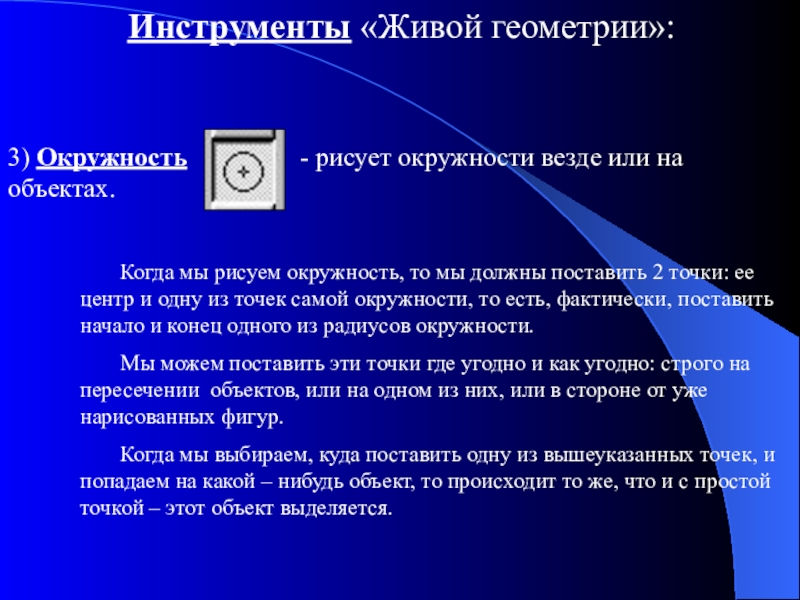 Когда мы рисуем окружность, то мы должны поставить 2 точки: ее центр и одну из точек самой окружности, то есть, фактически, поставить начало и конец одного из радиусов окружности.