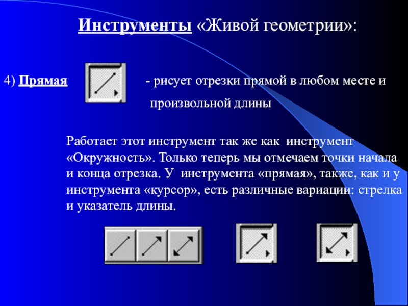 Работает этот инструмент так же как инструмент «Окружность». Только теперь мы отмечаем точки начала и конца отрезка. У инструмента «прямая», также, как и у инструмента «курсор», есть различные вариации: стрелка и указатель длины.