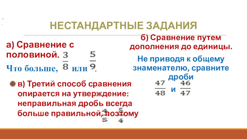 в) Третий способ сравнения опирается на утверждение: неправильная дробь всегда больше правильной, поэтому