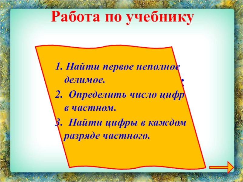 Алгоритм действий:1. Найти первое неполное делимое.2. Определить число цифр в частном.3. Найти цифры в каждом разряде частного.