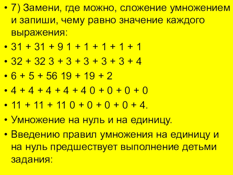 Слайд 747) Замени, где можно, сложение умножением и запиши, чему равно значение