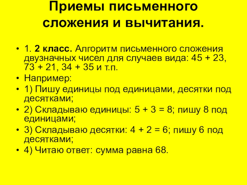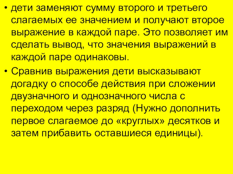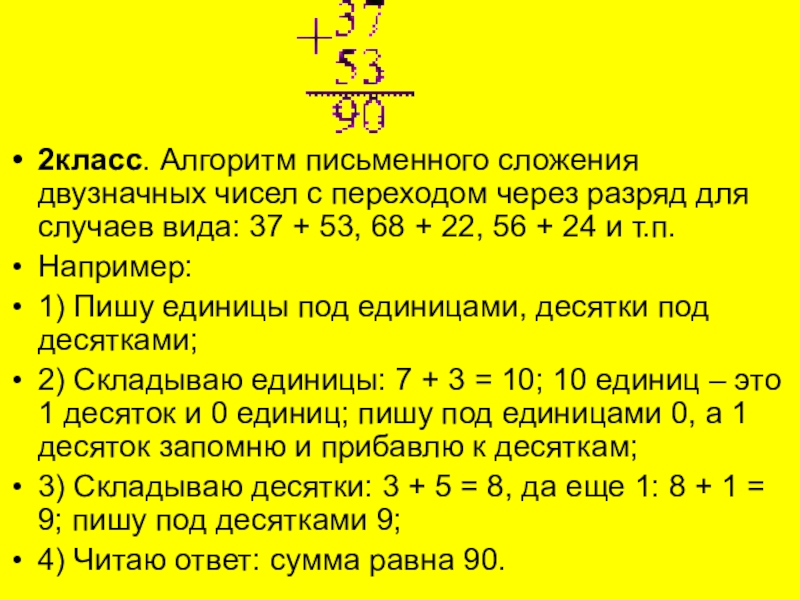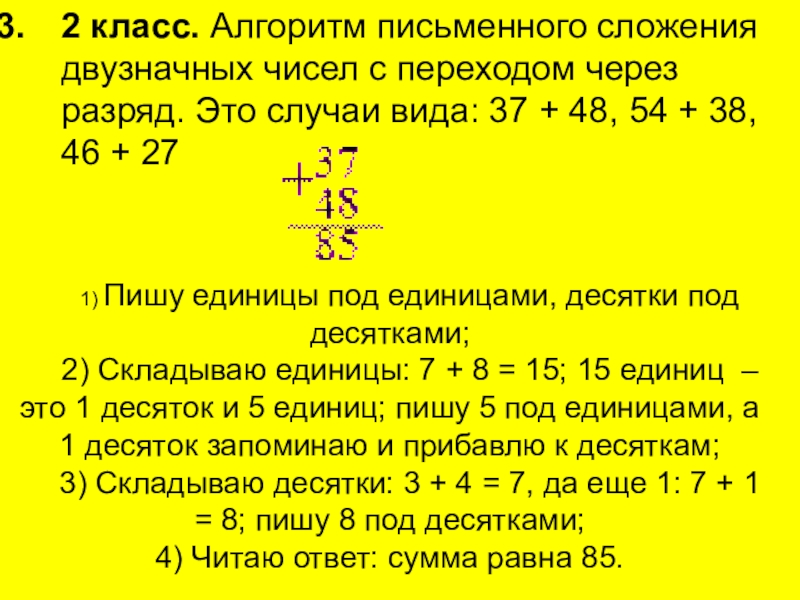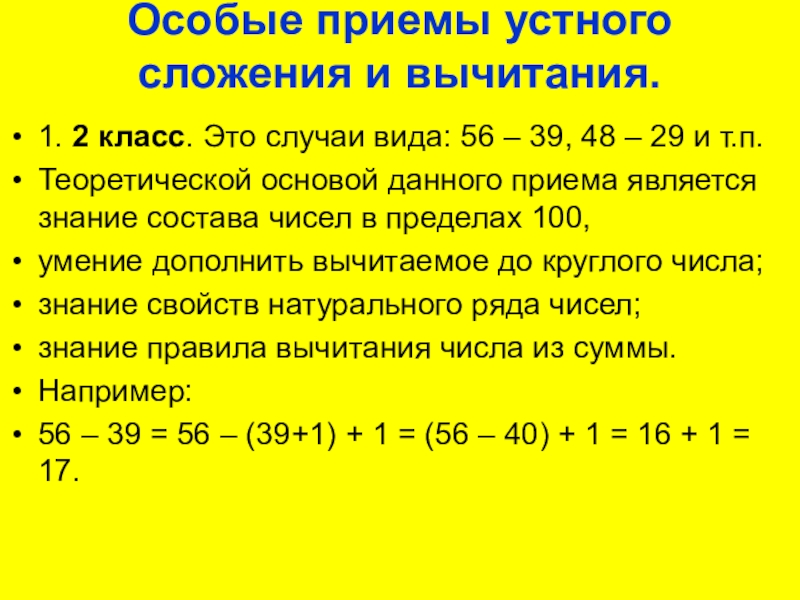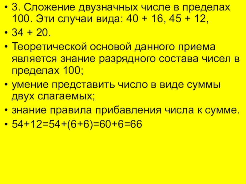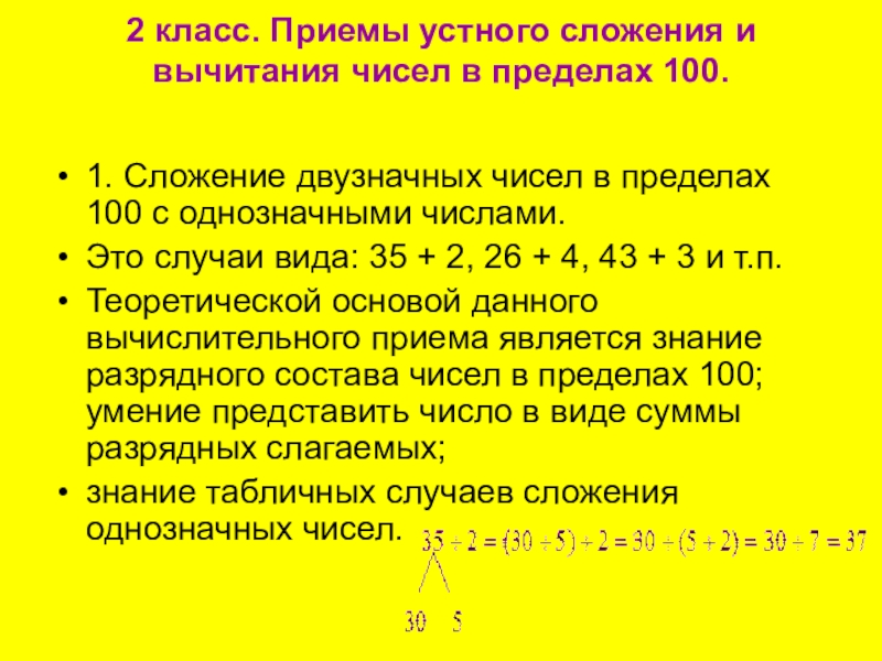 Теоретической основой данного вычислительного приема является знание разрядного состава чисел в пределах 100; умение представить число в виде суммы разрядных слагаемых;