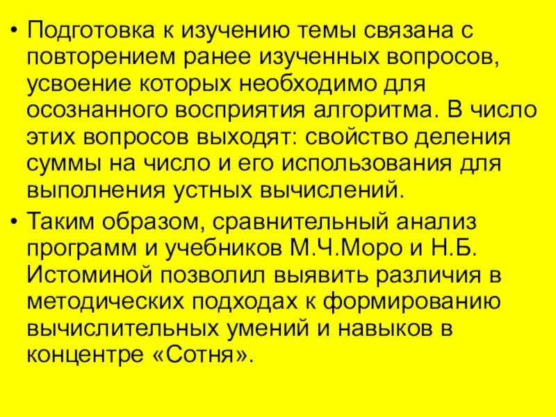 Таким образом, сравнительный анализ программ и учебников М.Ч.Моро и Н.Б.Истоминой позволил выявить различия в методических подходах к формированию вычислительных умений и навыков в концентре «Сотня».