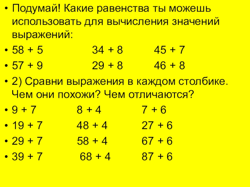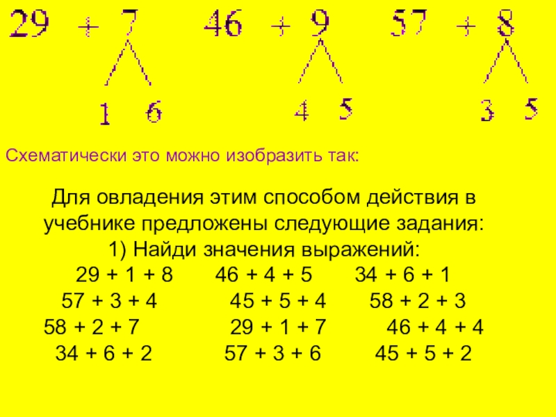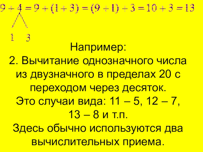 1. Сложение однозначных чисел с переходом через десяток. Это случаи вида: 9 + 4, 8 + 3,