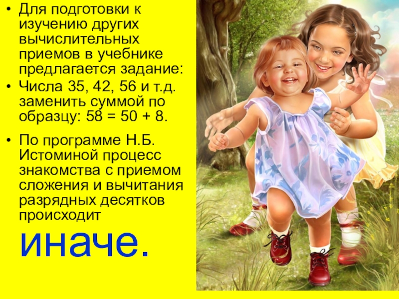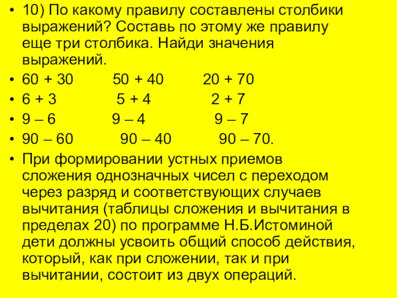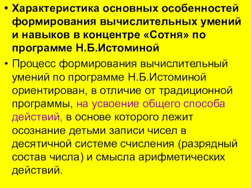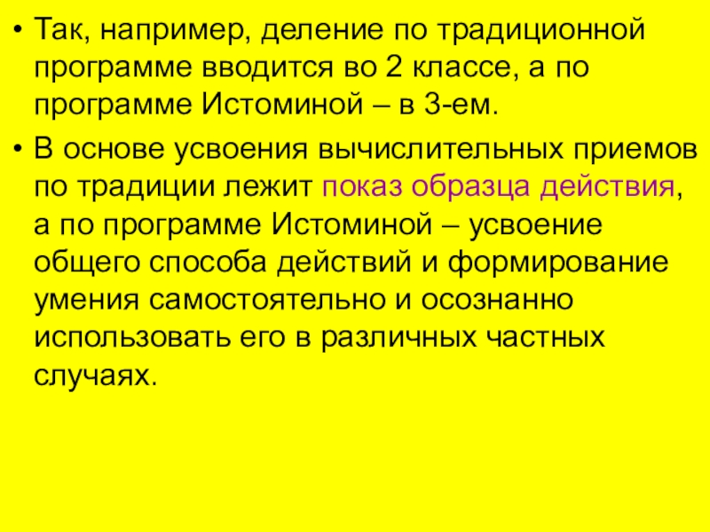 В основе усвоения вычислительных приемов по традиции лежит показ образца действия, а по программе Истоминой – усвоение общего способа действий и формирование умения самостоятельно и осознанно использовать его в различных частных случаях.