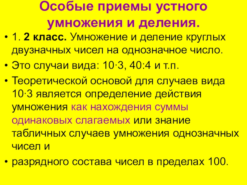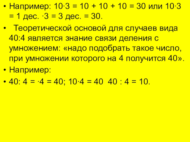 Теоретической основой для случаев вида 10∙3 является определение действия умножения как нахождения суммы одинаковых слагаемых или знание табличных случаев умножения однозначных чисел и