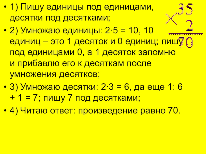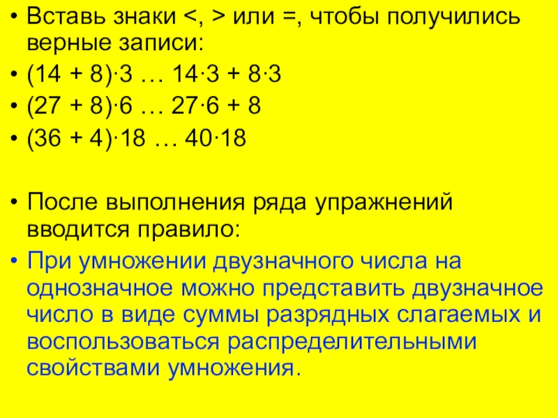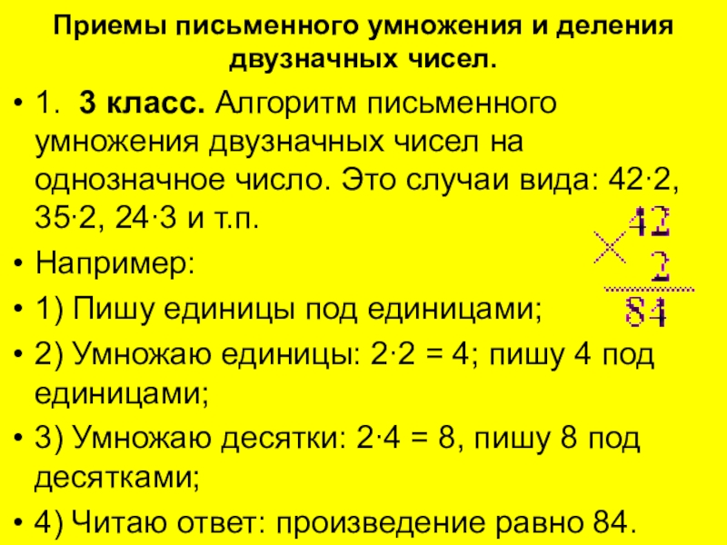 При умножении двузначного числа на однозначное можно представить двузначное число в виде суммы разрядных слагаемых и воспользоваться распределительными свойствами умножения.