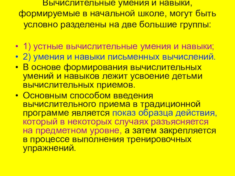 Слайд 8Вычислительные умения и навыки, формируемые в начальной школе, могут быть условно
