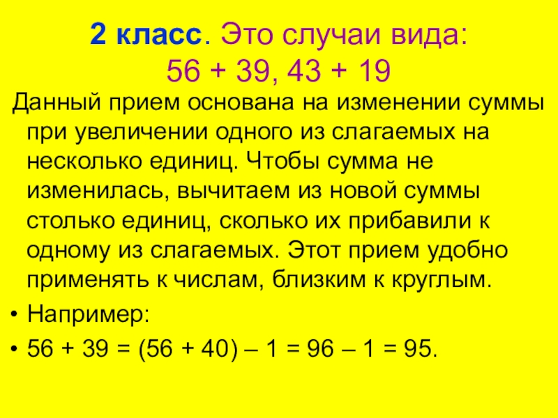 Данный прием основана на изменении суммы при увеличении одного из слагаемых на несколько единиц. Чтобы сумма не изменилась, вычитаем из новой суммы столько единиц, сколько их прибавили к одному из слагаемых. Этот прием удобно применять к числам, близким к круглым.