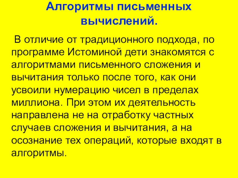 дети знакомятся с алгоритмами письменного сложения и вычитания только после того, как они усвоили нумерацию чисел в пределах миллиона. При этом их деятельность направлена не на отработку частных случаев сложения и вычитания, а на осознание тех операций, которые входят в алгоритмы.