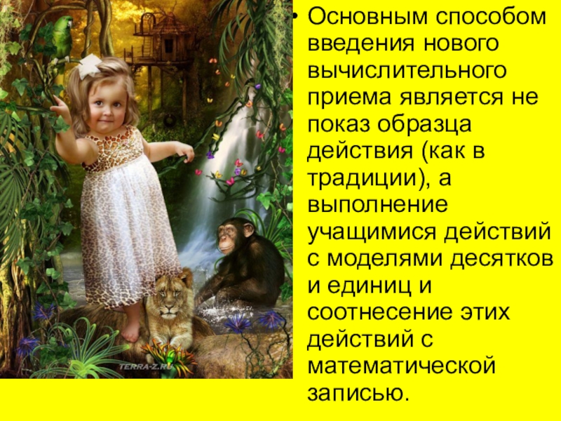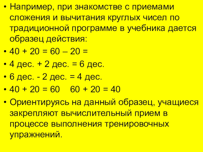 Основным способом введения вычислительного приема в традиционной программе является показ образца действия, который в некоторых случаях разъясняется на предметном уровне, а затем закрепляется в процессе выполнения тренировочных упражнений.
