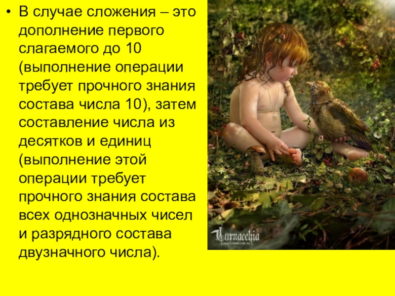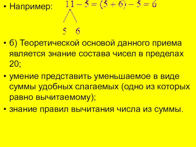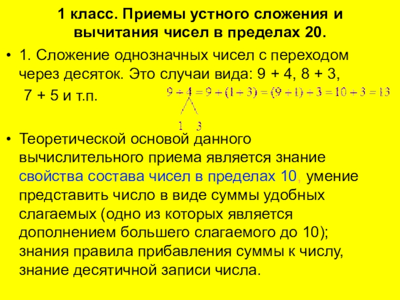 Теоретической основой данного вычислительного приема является знание свойства состава чисел в пределах 10, умение представить число в виде суммы удобных слагаемых (одно из которых является дополнением большего слагаемого до 10); знания правила прибавления суммы к числу, знание десятичной записи числа.