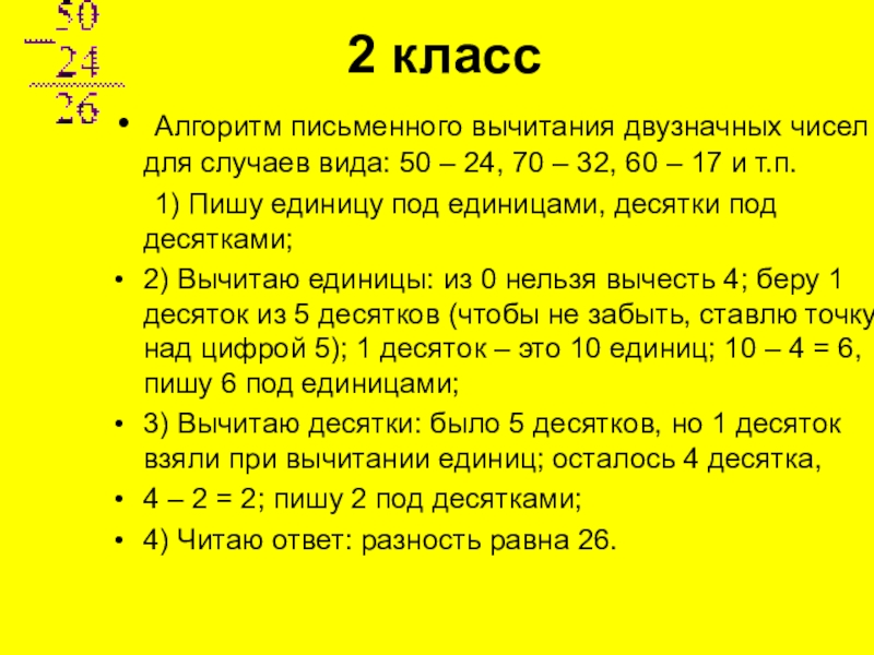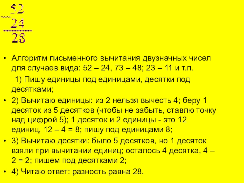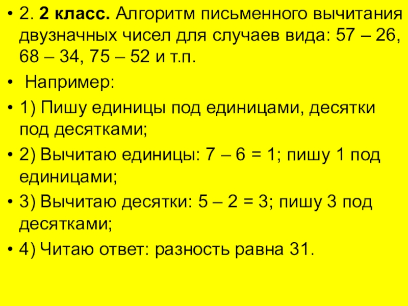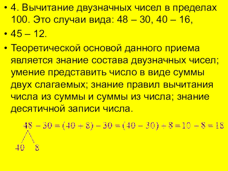 Теоретической основой вычитания для случаев вида: 35 – 2 является знание разрядного состава чисел в пределах 100, умение представить число в виде суммы разрядных слагаемых, знание правил вычитания числа из суммы, знание табличных случаев сложения однозначных чисел и соответствующих случаев вычитания.