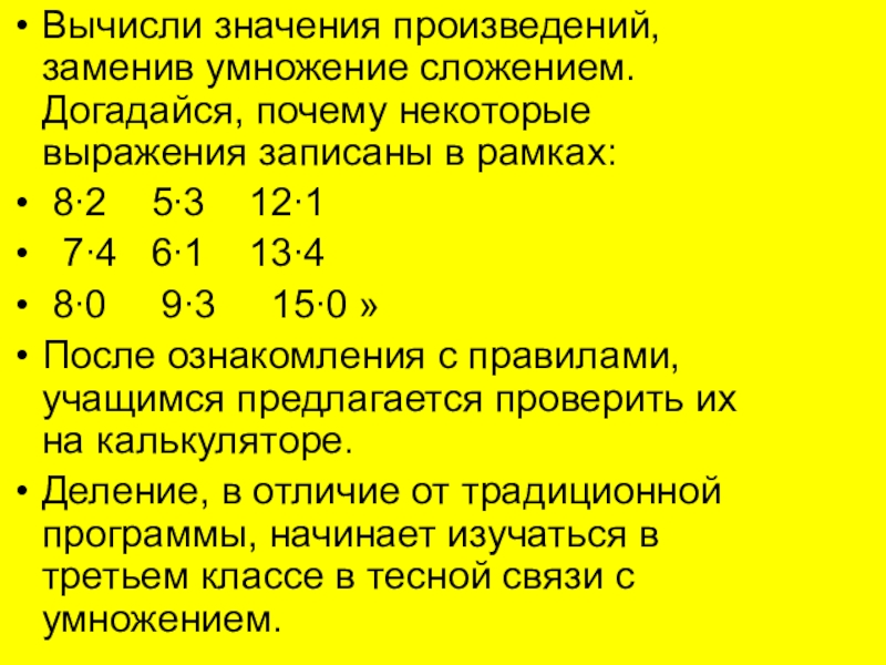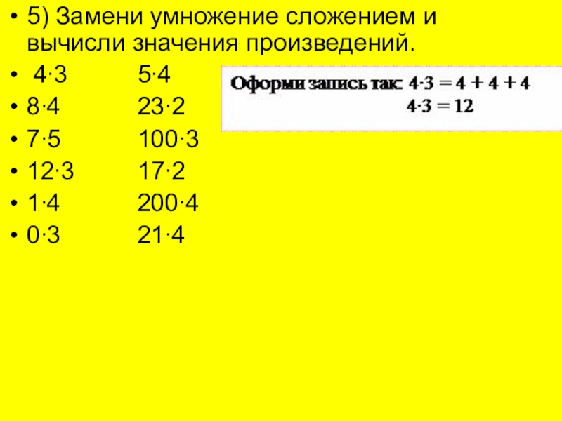 Слайд 75Вычисли значения произведений, заменив умножение сложением. Догадайся, почему некоторые выражения записаны