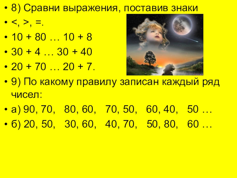 Слайд 82Вставь знаки или =, чтобы получились верные записи: