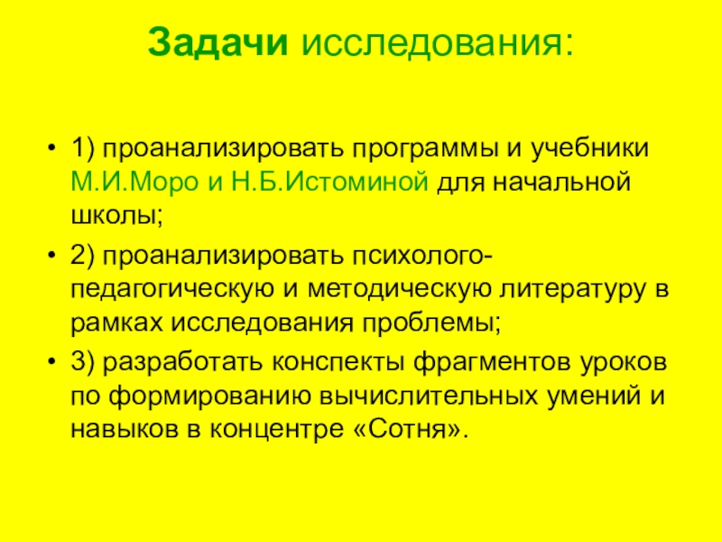 выявить особенности формирования вычислительных умений и навыков в концентре «Сотня» по программе Н.Б.Истоминой.