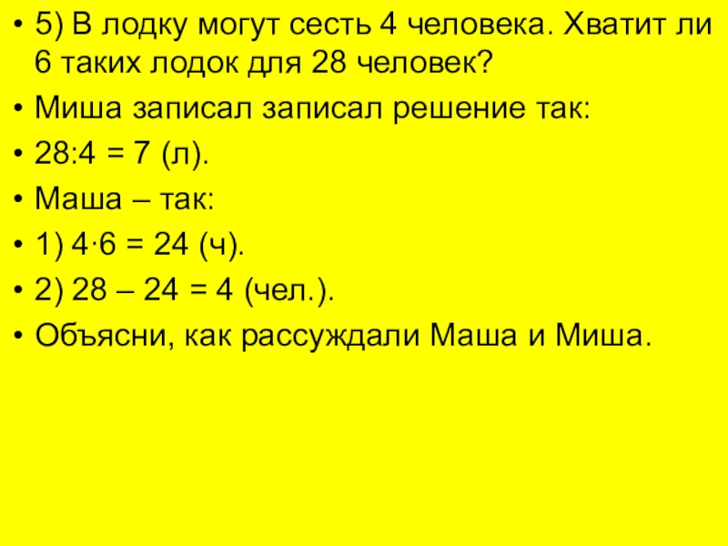 Слайд 785) В лодку могут сесть 4 человека. Хватит ли 6 таких