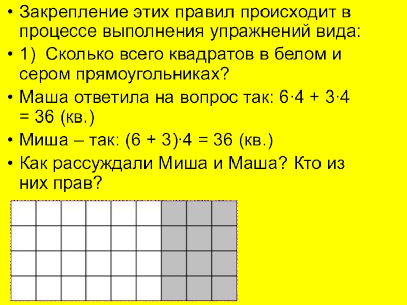 Маша ответила на вопрос так: 6∙4 + 3∙4 = 36 (кв.)