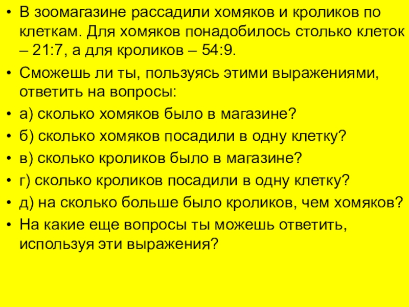 Слайд 77В зоомагазине рассадили хомяков и кроликов по клеткам. Для хомяков понадобилось