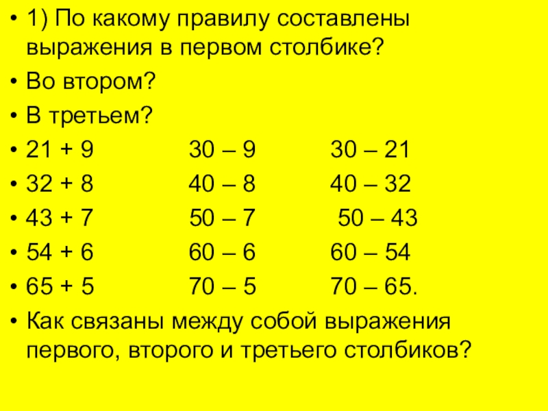 знание состава двузначных чисел; знание правила вычитания суммы из числа.