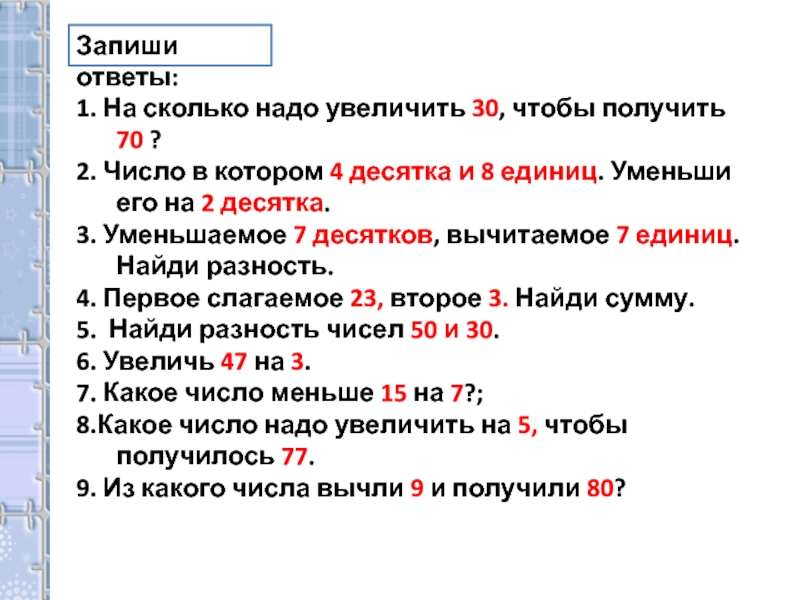 Запиши ответы:1. На сколько надо увеличить 30, чтобы получить 70 ?2. Число в котором 4 десятка и