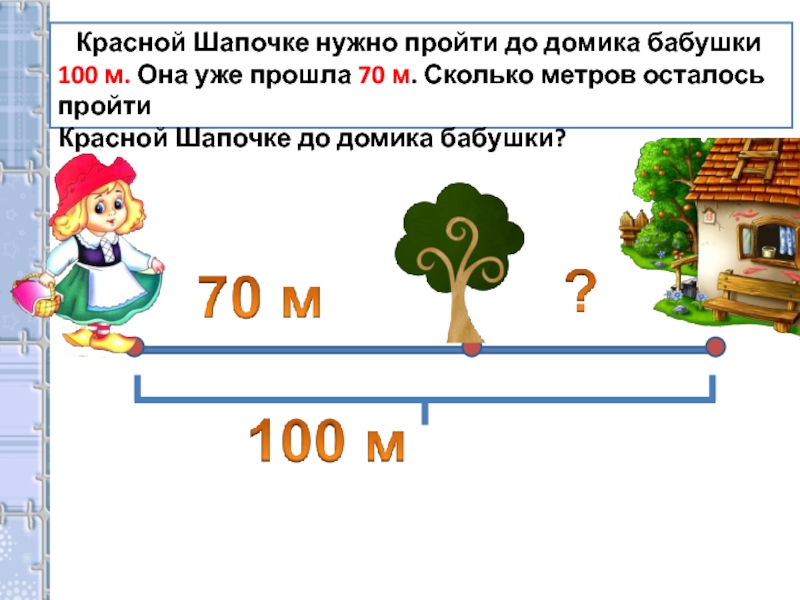 Красной Шапочке нужно пройти до домика бабушки 100 м. Она уже прошла 70 м. Сколько