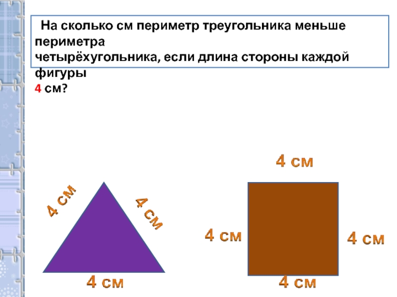 На сколько см периметр треугольника меньше периметра четырёхугольника, если длина стороны каждой фигуры 4 см?