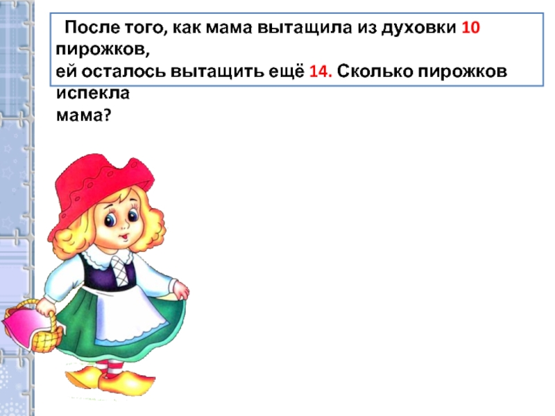 После того, как мама вытащила из духовки 10 пирожков,ей осталось вытащить ещё 14. Сколько пирожков испекла